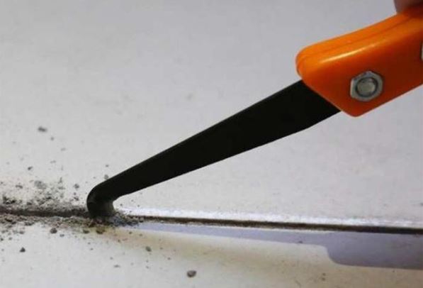 1、首先做施工前的準備,處理瓷磚縫,用小鏟子把瓷磚縫先鏟出一個2毫米以內深的凹槽,這樣不僅便於打美縫劑,而且美縫劑存於這個凹槽中也可以避免日後的過度磨損。
