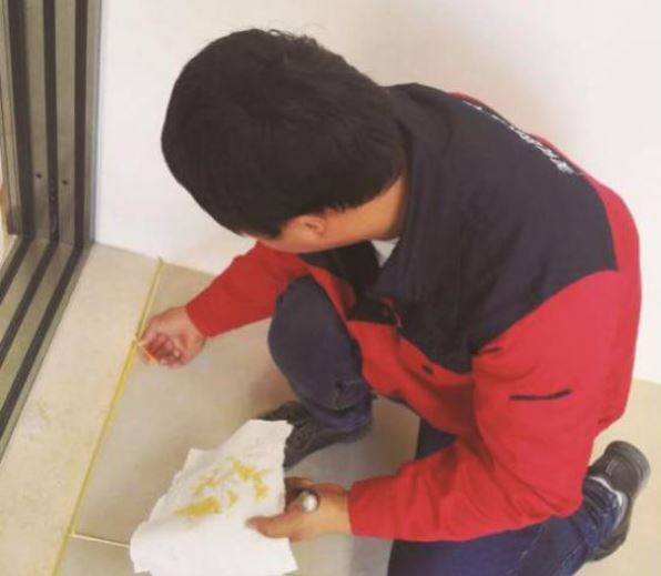 2、清潔瓷磚縫隙內部的粉塵:用吸塵器或者掃把掃幹淨;必須保證瓷磚縫隙內不潮濕,無粉塵,顆粒;